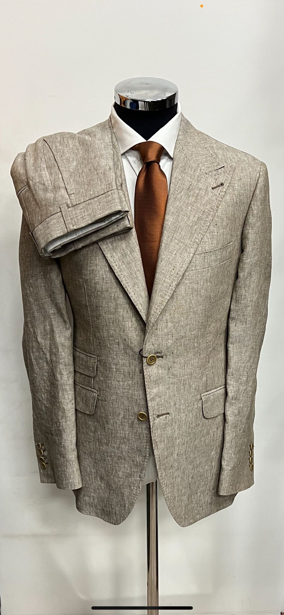 Beige/tan luxury linen suit with 5 inch peak lapel double stitched. Ticket pocket, double vent jacket, open button sleeves. Flat front pants. Limited quantity made in size 40-60 R/L. We can change the button to match your style for additional cost.