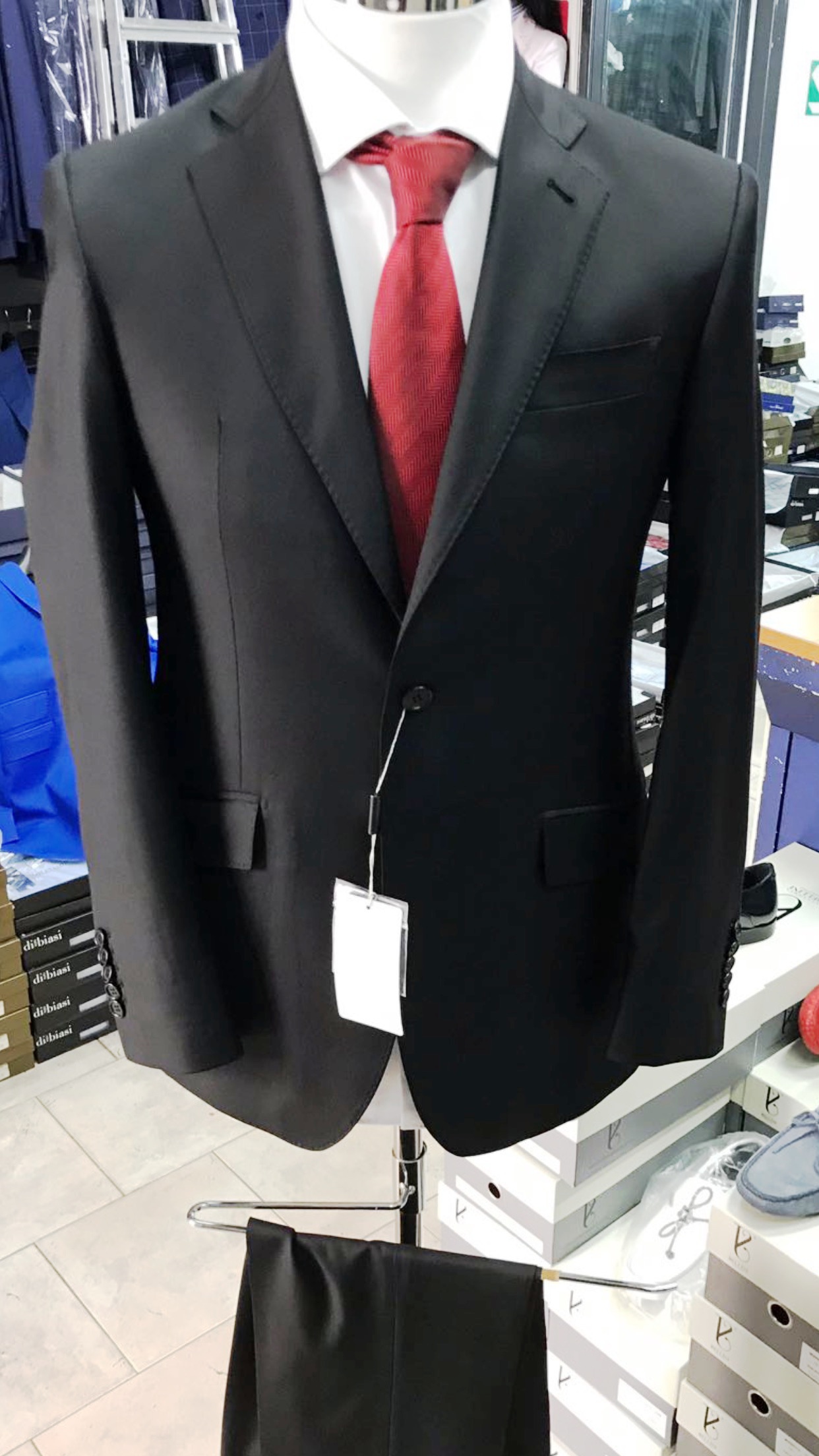 Black classic super 150 Cerruti wool suit with notch lapel/double vent/open button sleeves/flat front pant.