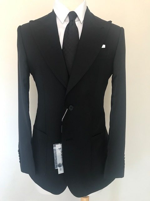 Black super 150 Cerruti wool suit with wide 5 inch peak lapel double stitched with patch pocket/side buckles on pant. Available in size 36-54 reg/long