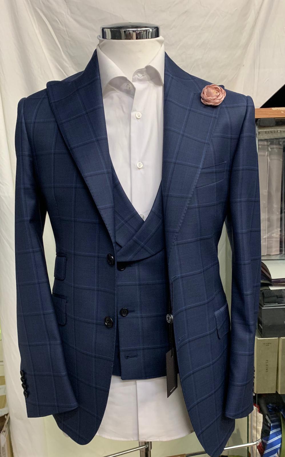 Blue 3 piece windowpane super 150 Cerruti wool suit with matching double breasted vest. Wide 5 inch peak lapel, ticket pocket, Neapolitan soft shoulder, flat front pant. Available in size 36-50 or can be custom made in any size for as little as $850