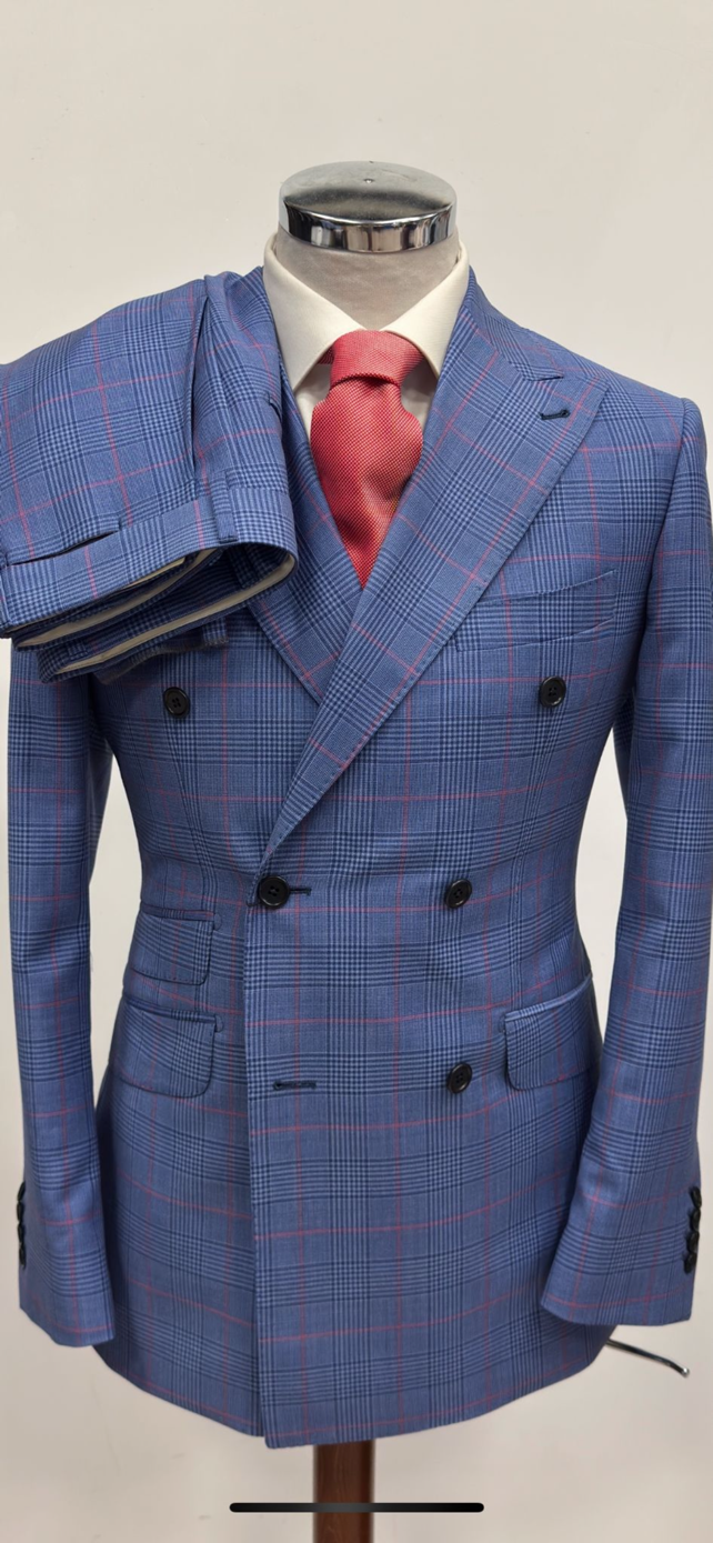 Blue plaid with pink under tone super 180 double breasted wool suit -Made in Italy