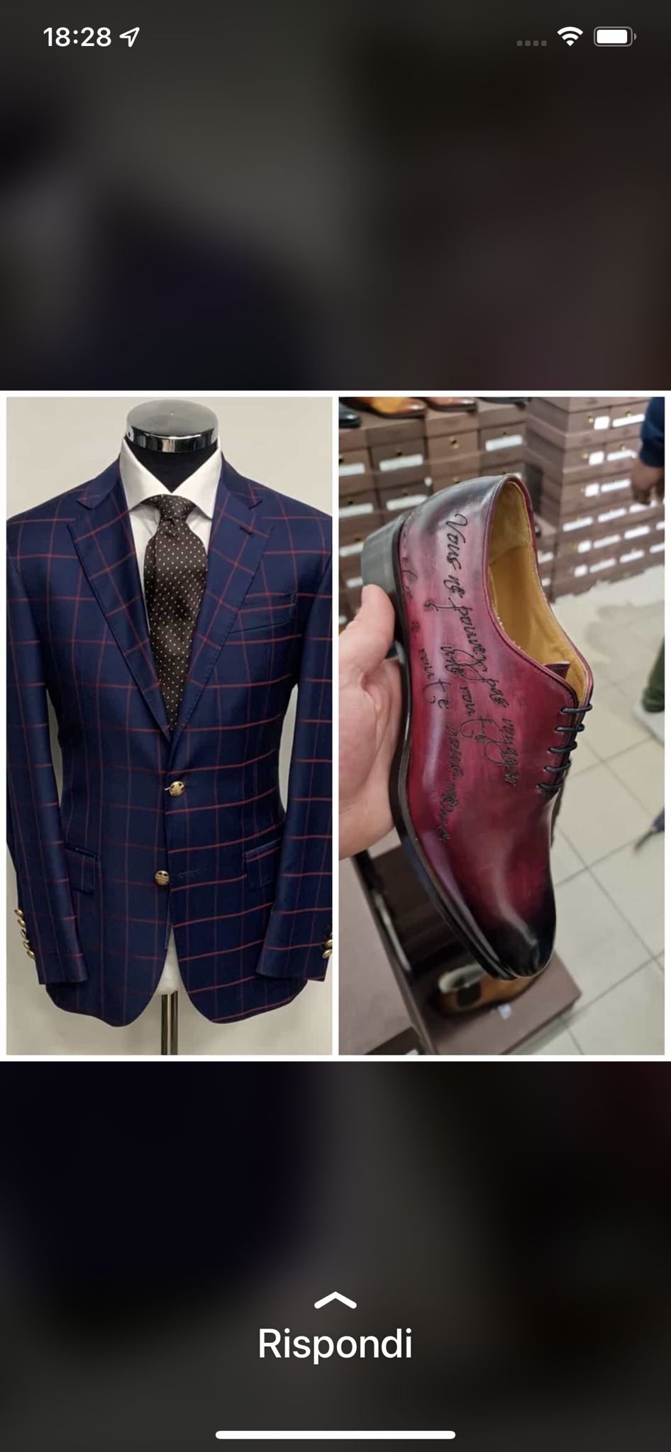 Blue with red windowpane super 150 Cerruti wool blazer with matching all leather burgundy lace up. Soft Neapolitan shoulders on the suit, ticket pocket, wide 5 inch peak lapel, versatile and relax fit, flat front pant. Available in size 38-60 R/L. Both combination on sale. I will put this blazer and any of our collection against any suit from Savile row in London.