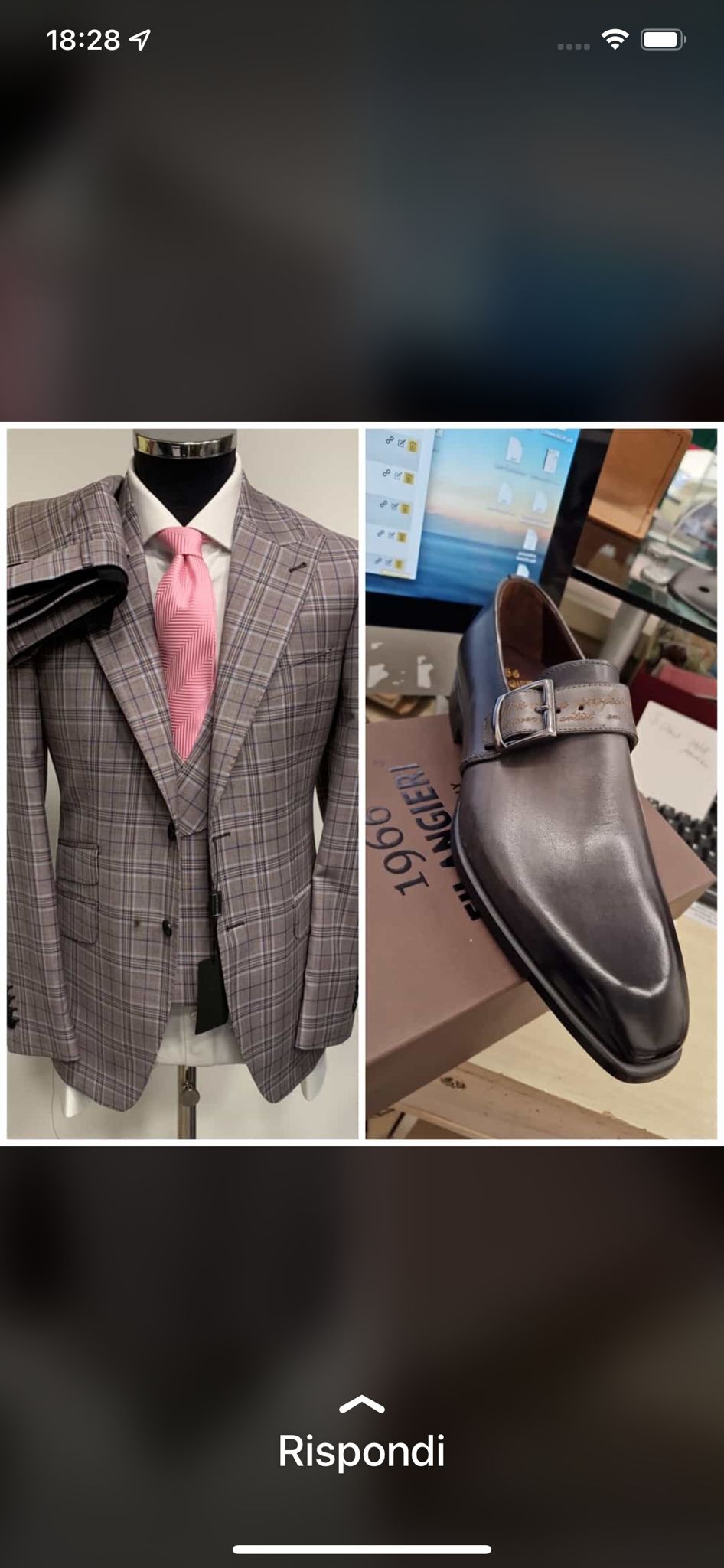 Brown plaid super 150 Cerruti 3 piece wool suit with matching double breasted vest and matching single strap all leather shoe. Soft Neapolitan shoulders on the suit, wide peak lapel, versatile and relax fit, flat front pant. Available in size 38-60 R/L. Both combination on sale. I will put this suit and any of our collection against any suit from Savile row in London.