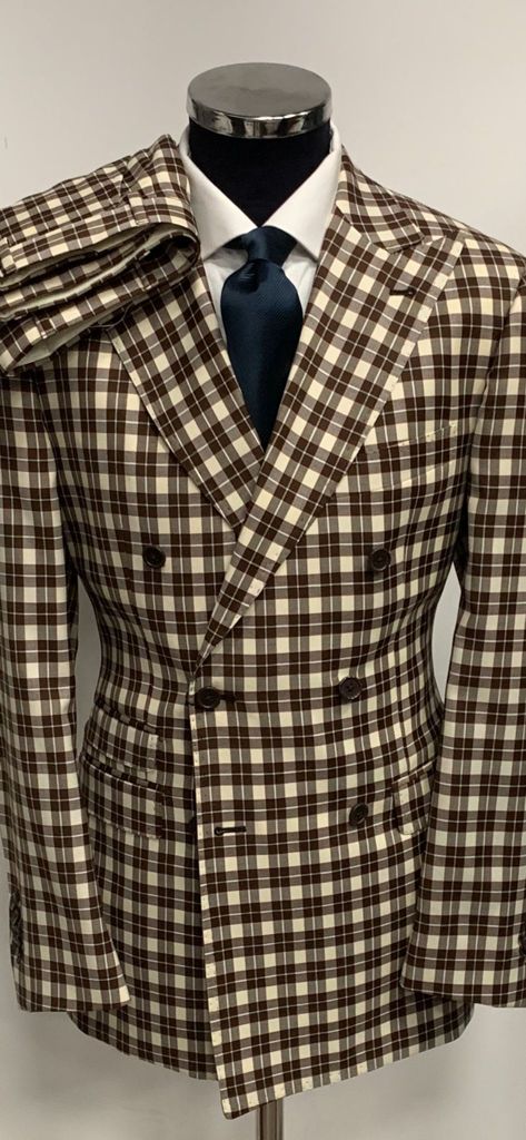 Brown Tartan plaid super 150 Cerruti 1881 double breasted wool suit. Wide 5 inch peak lapel, hand stitched, ticket pocket. Flat front pant. Available in size 36-60R/Long