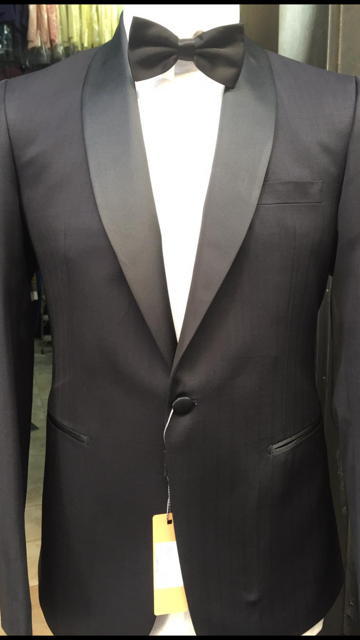 Classic black tuxedo with black silk shawl lapel. Double vent, flat front pant with side silk pipping. Available in size: 38,40,42,44,46,48,50 regular and long