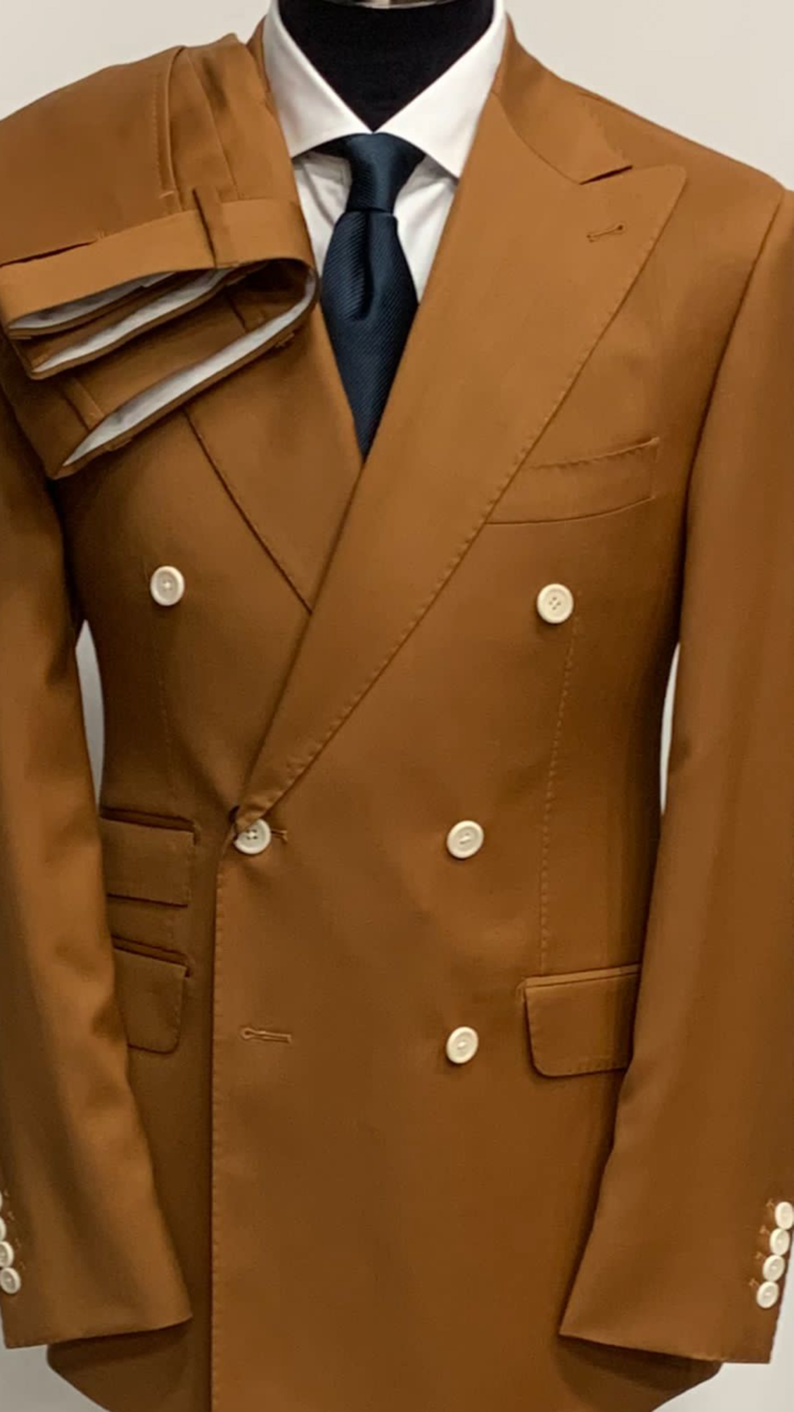 Copper color super 150 Cerruti 1881 double breasted wool suit. Wide 5 inch peak lapel, hand stitched, ticket pocket. Flat front pant. Available in size 36-60R