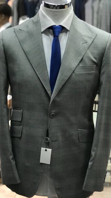 Grey shark skin faint windowpane 2 button super 150 Cerruti wool suit with wide 5 inch hand stitched peak lapel, slanted ticket pocket, flat front pant, double vent. Slim fit. Available in sizes: 38-50 Reg/Long
