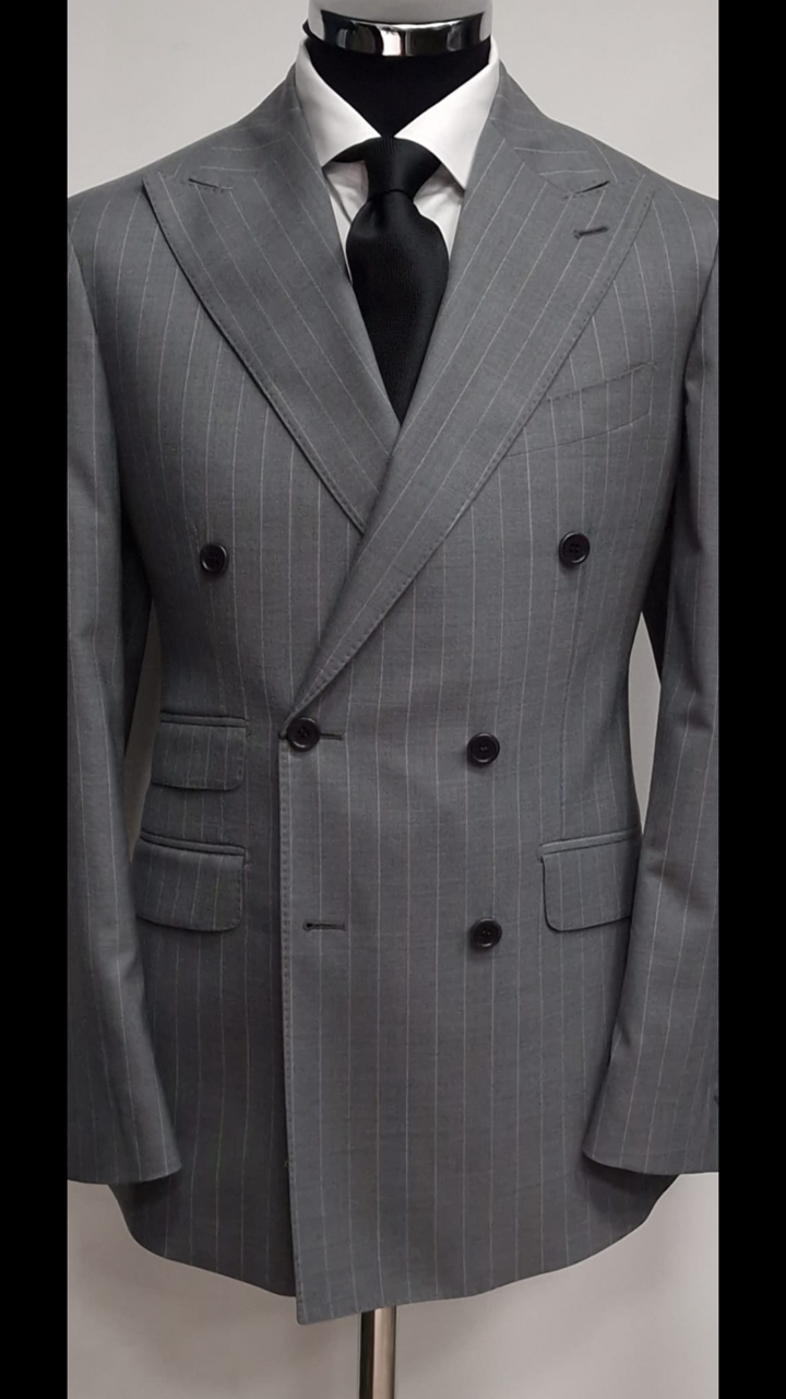 Grey shark skin pinstripe super 150 Cerruti double breasted wool suit. Wide peak lapel single stitched, ticket pocket, double back vents, flat front pant. Available in size: 40-60 R/L.