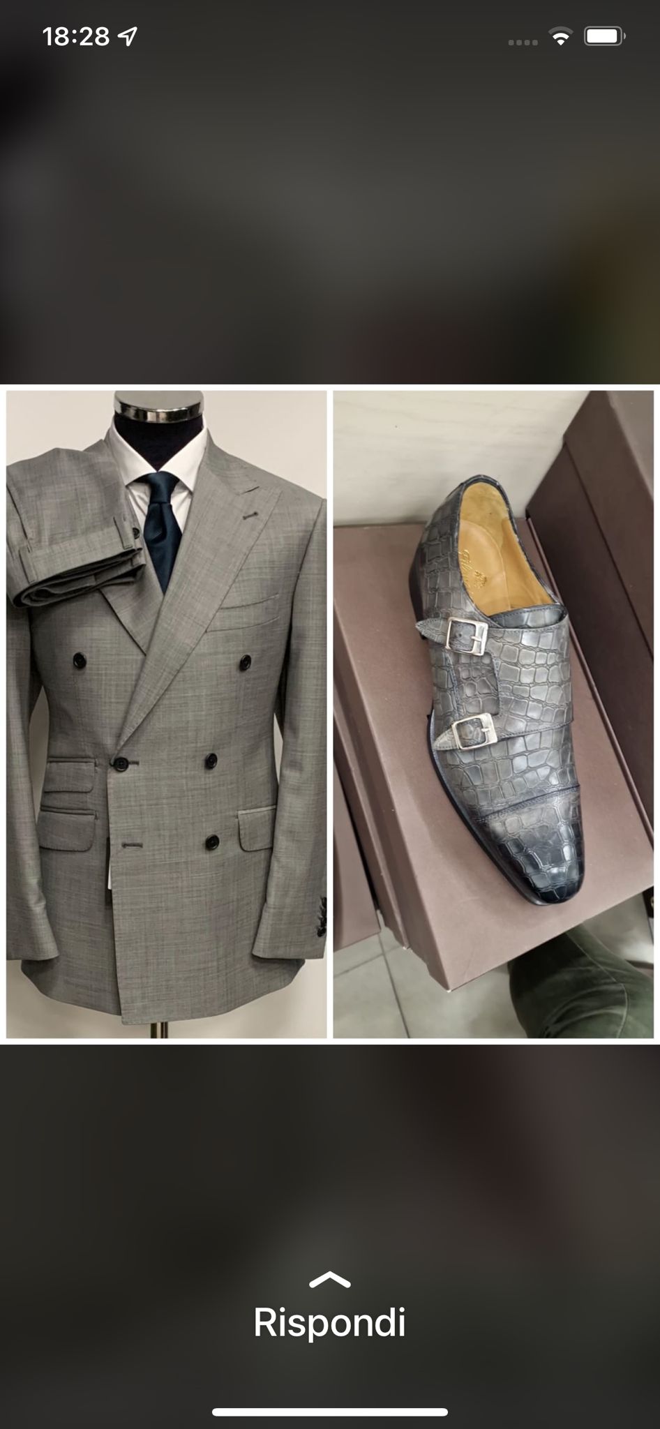 Grey sharkskin super 150 Cerruti double breasted wool suit with matching all grey skin print double monk strap. Soft Neapolitan shoulders on the suit, wide peak lapel, versatile and relax fit, flat front pant. Available in size 38-60 R/L. Both combination on sale. I will put this suit and any of our collection against any suit from Savile row in London.