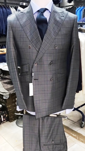 Grey windowpane super 150 Cerruti double breasted wool suit with wide 5 inch hand stitched peak lapel, slanted ticket pocket, flat front pant, double vent. Slim fit. Available in sizes: 38-50 Reg/Long