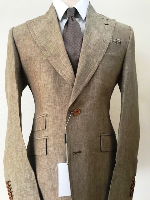 Khaki brown linen summer suit with a wide peak lapel double stitched, flat front pants with side buckles. Ticket pocket on the jacket with double vent.