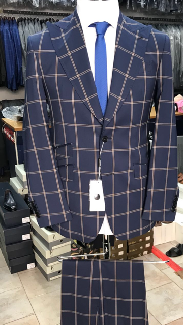 Navy 2 button super 150 Cerruti windowpane wool suit with wide 5 inch hand stitched peak lapel, slanted ticket pocket, flat front pant, double vent. Slim fit. Available in sizes: 38-50 Reg/Long