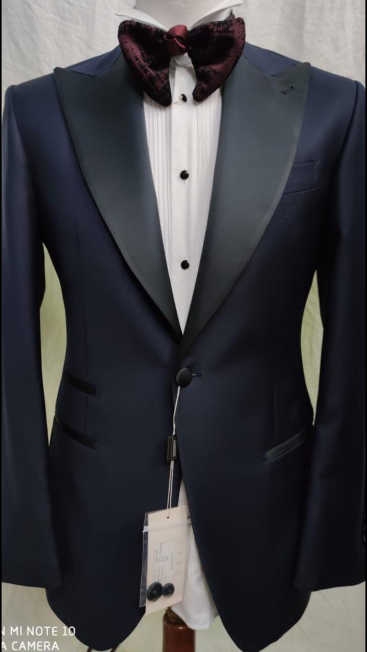 Navy blue and black silk 5 inch wide peak lapel luxury tuxedo. With double vents, ticket pocket. Available in sizes 36-52R/L and can be custom in any size.