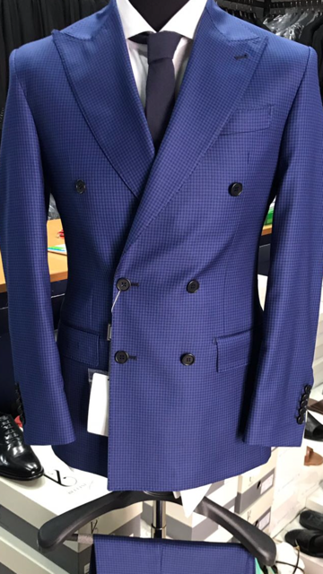 Navy blue gingham super 150 Cerruti double breasted wool suit with wide peak lapel double vent/open button sleeves/flat front pant.