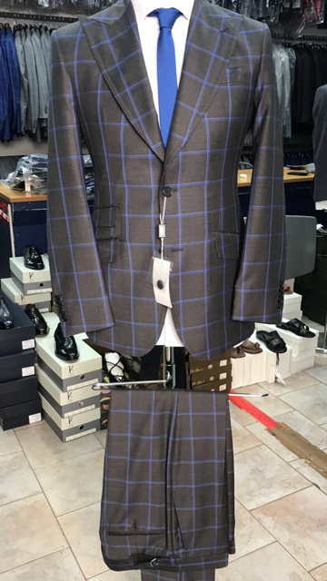 Navy/blue windowpane 2 button super 150 Cerruti windowpane wool suit with wide 5 inch hand stitched peak lapel, slanted ticket pocket, flat front pant, double vent. Slim fit. Available in sizes: 38-50 Reg/Long