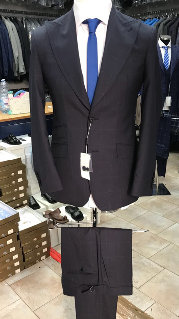 Navy faint windowpane 2 button super 150 Cerruti wool suit with wide 5 inch hand stitched peak lapel, slanted ticket pocket, flat front pant, double vent. Slim fit. Available in sizes: 38-50 Reg/Long
