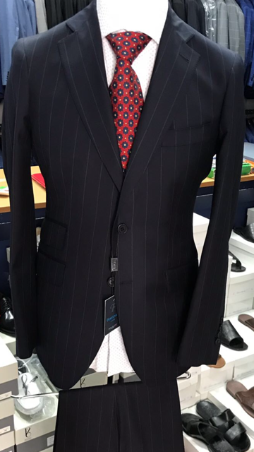 Navy pinstripe super 150 Cerruti 2 button wool suit with notch lapel double vent/open button sleeves/flat front pant/ticket pocket.