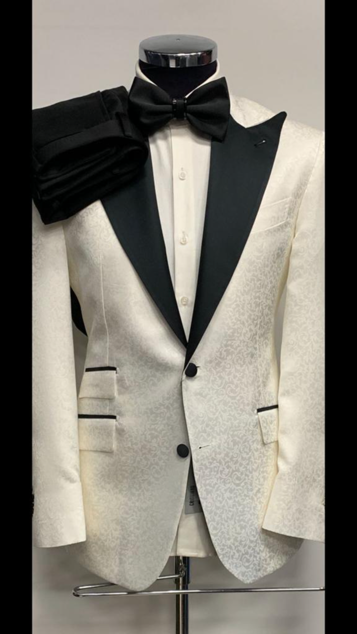 Off-white/Ivory Jacquard tuxedo with wide peak lapel and ticket pocket. Paired with super 150 Cerruti wool flat front pant. Available in size: 38-60 Regular and Long.