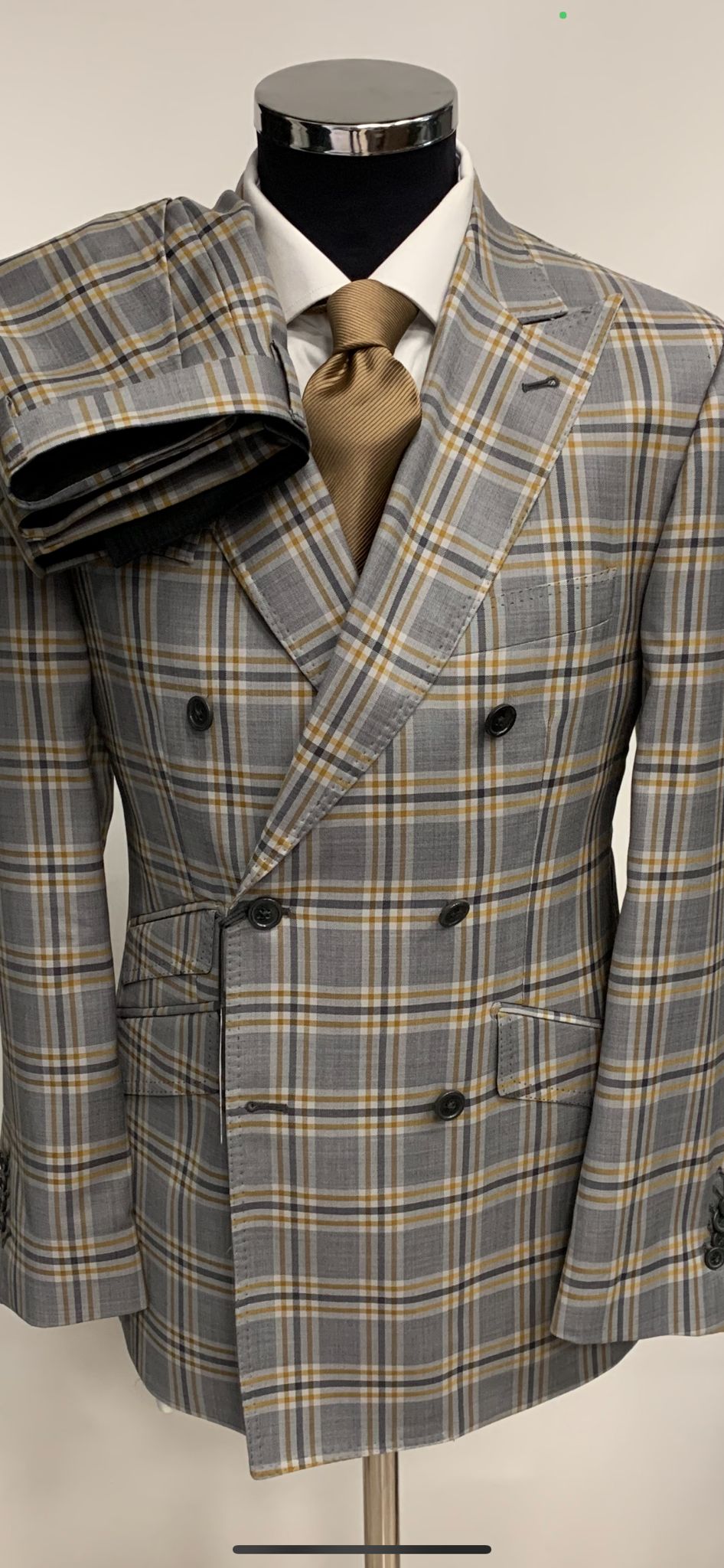 Olive tan plaid double breasted super 150 Cerruti wool suit with wide 5 inch peak lapel, double stitched. 10 inch double vents, ticket pocket, flat front pant. Available in size: 38R-50R or Long. Also custom made in any size.
