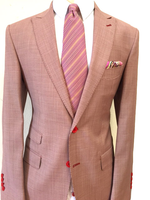 Pink 2 button super 150 wool suit. Hand stitched peak lapel. Double vent, ticket pocket.