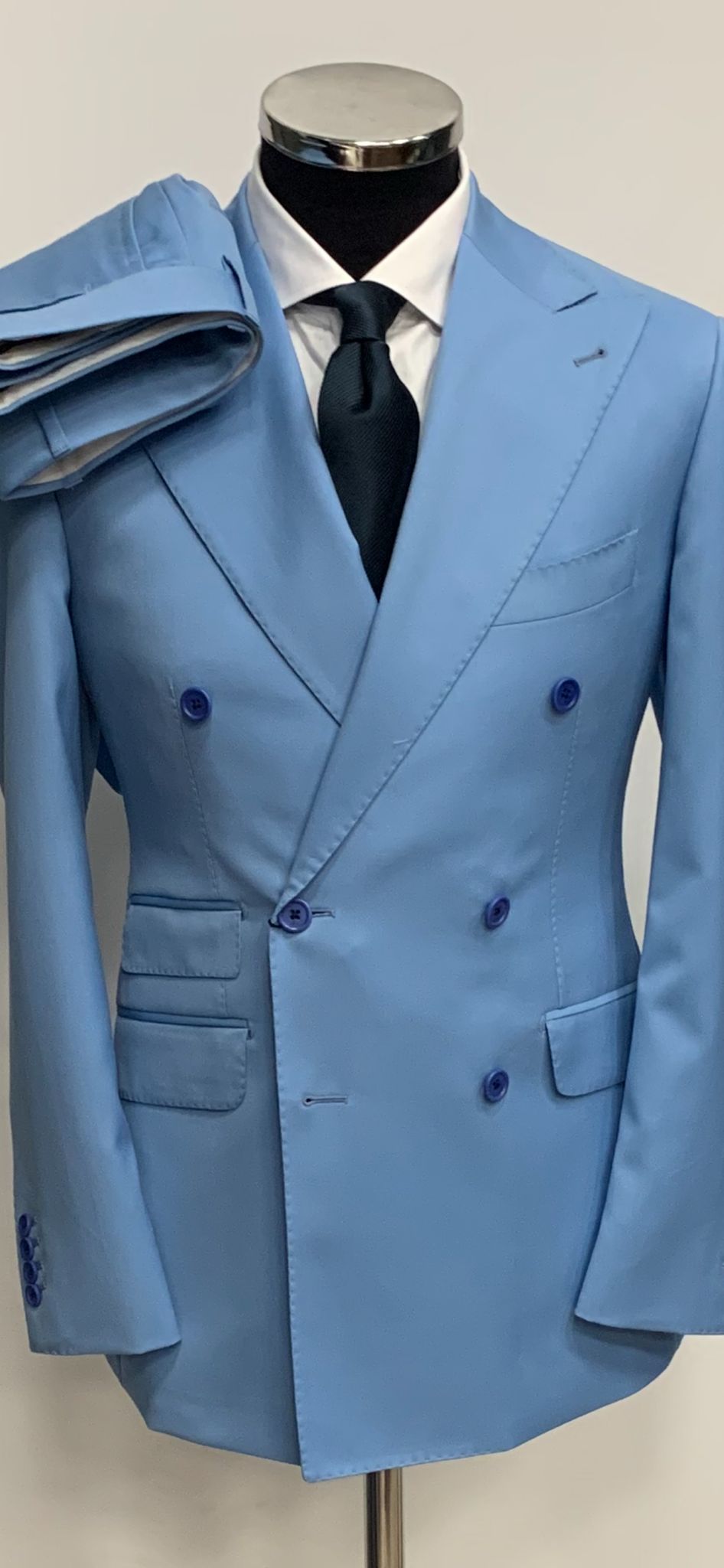 Sky blue super 150 Cerruti 1881 double breasted wool suit. Wide 5 inch peak lapel, hand stitched, ticket pocket. Flat front pant. Available in size 36-60R