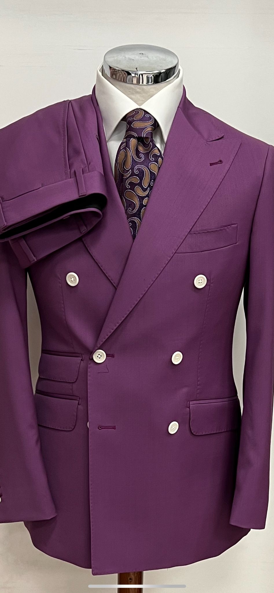 Stunning plum super 150 Cerruti double breasted wool suit with wide peak lapel. Ticket pocket, double vent. Flat front pant. Available in size 38-60R/L
