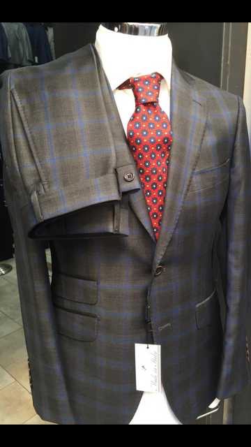 Super 150 Cerruti dark grey plaid notch lapel wool suit with ticket pocket, double vents available in size 36-52 regular.